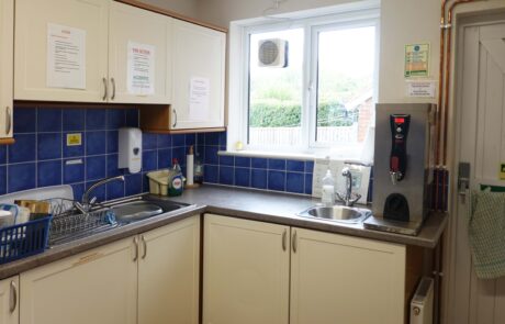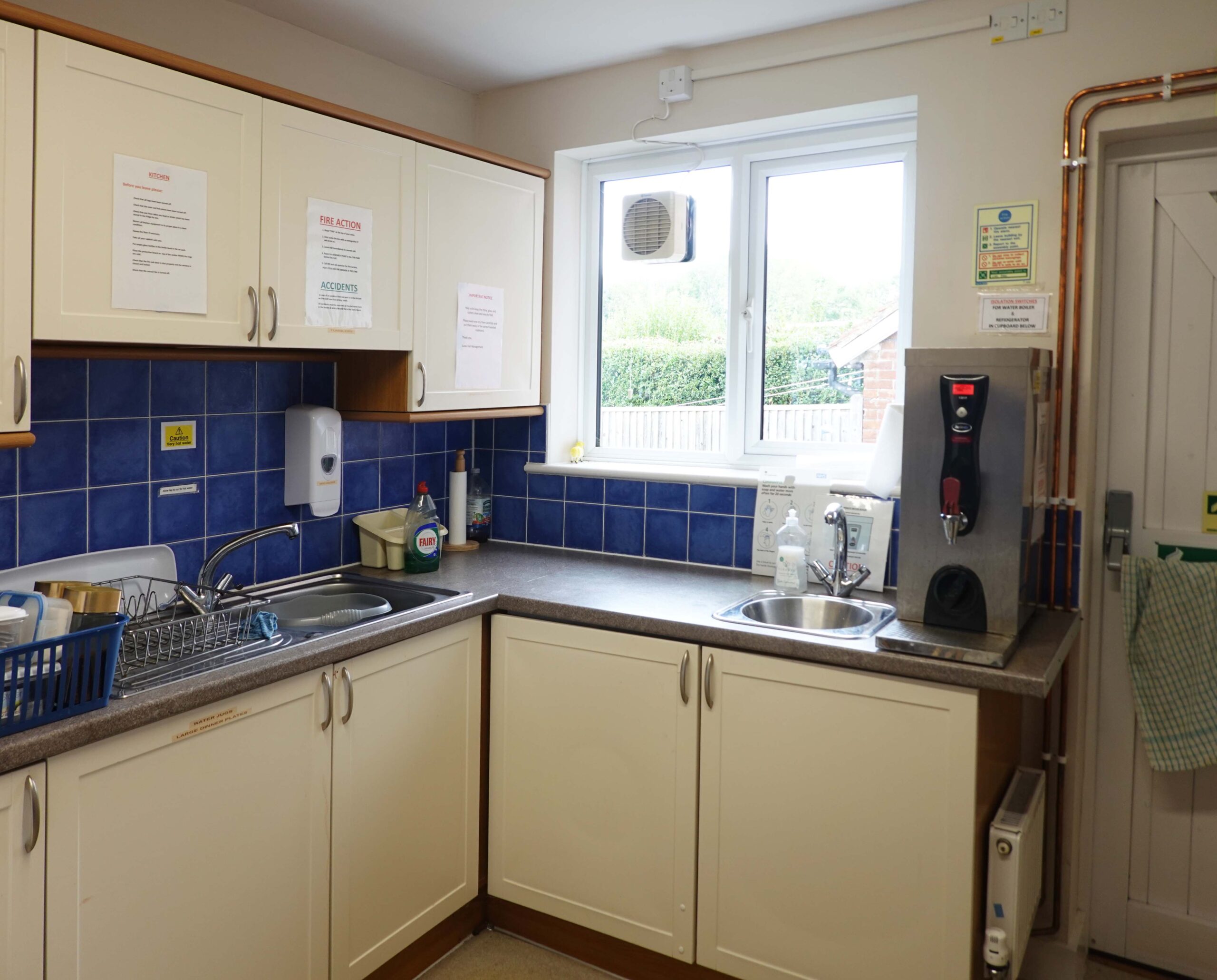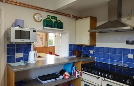 - Boiling water supply for tea, etc. Cooker with four rings, fridge, microwave, storage.